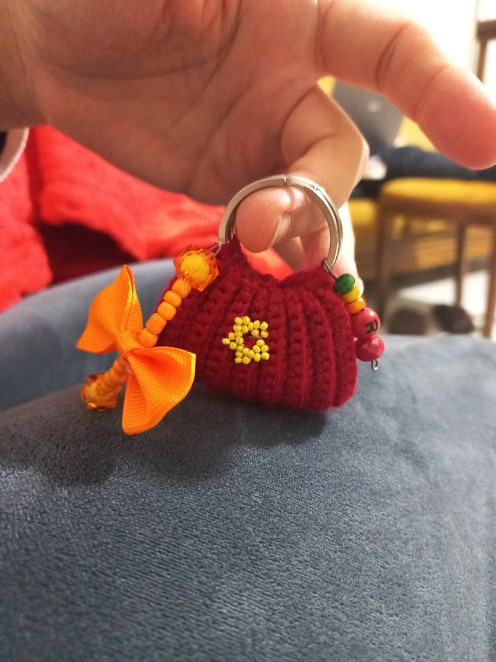 Renkli, örgü bohem tarzda küçük kırmızı kese anahtarlık, boncuk ve turuncu fiyonk ile süslenmiştir. Retro ve hippie dokunuş katar.