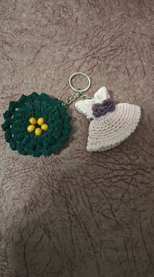 Renkli örgüden yapılmış çiçek ve küçük elbise figürlü bohem anahtarlık, rahat ve retro tarzı yansıtır.