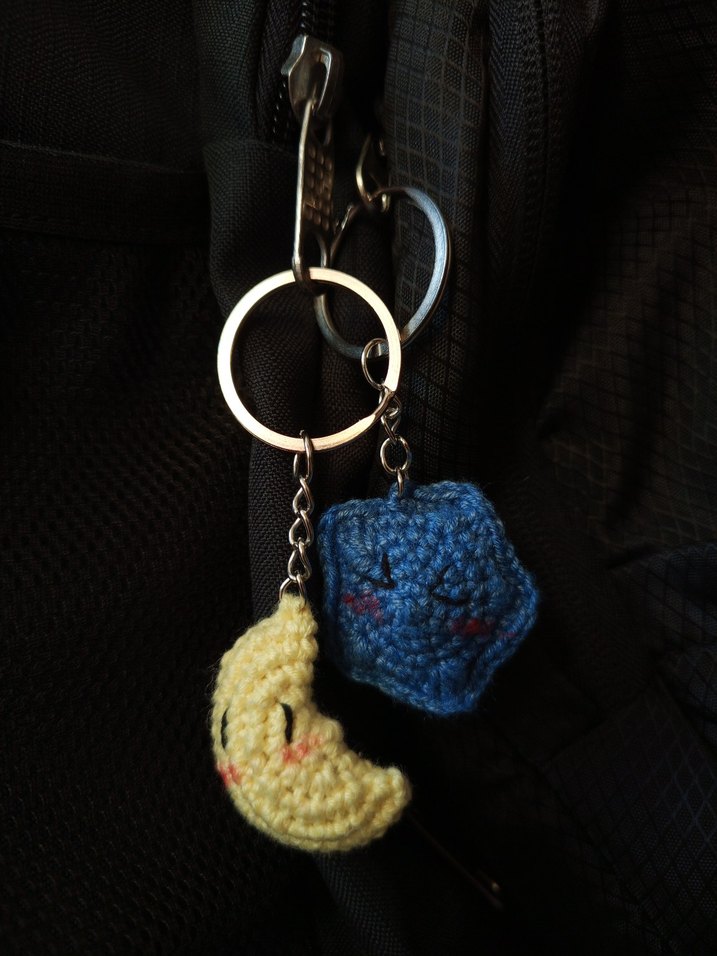 Renkli örgü malzemeden yapılmış, mavi ve sarı ay ve yıldız figürlü, bohem tarzda rahat bir kadın anahtarlığı.