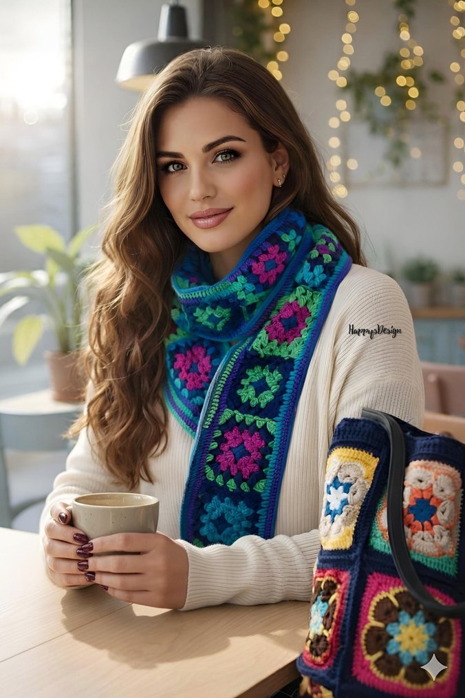 Bu çok renkli örgü atkı, bohem tarzda ince desenler ve hafif canlı tonlar içerir, rahat bir görünüm sağlar.
