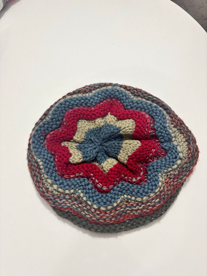 Bu renkli örgü bere, çok renkli deseniyle rahat ve bohem tarzı yansıtıyor. Retro esintili görünüm için ideal.