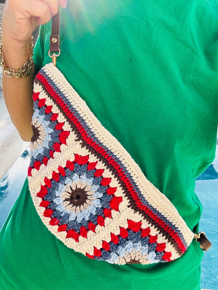 Gündelik kullanım için renkli, örgü bohem kadın çantası.
