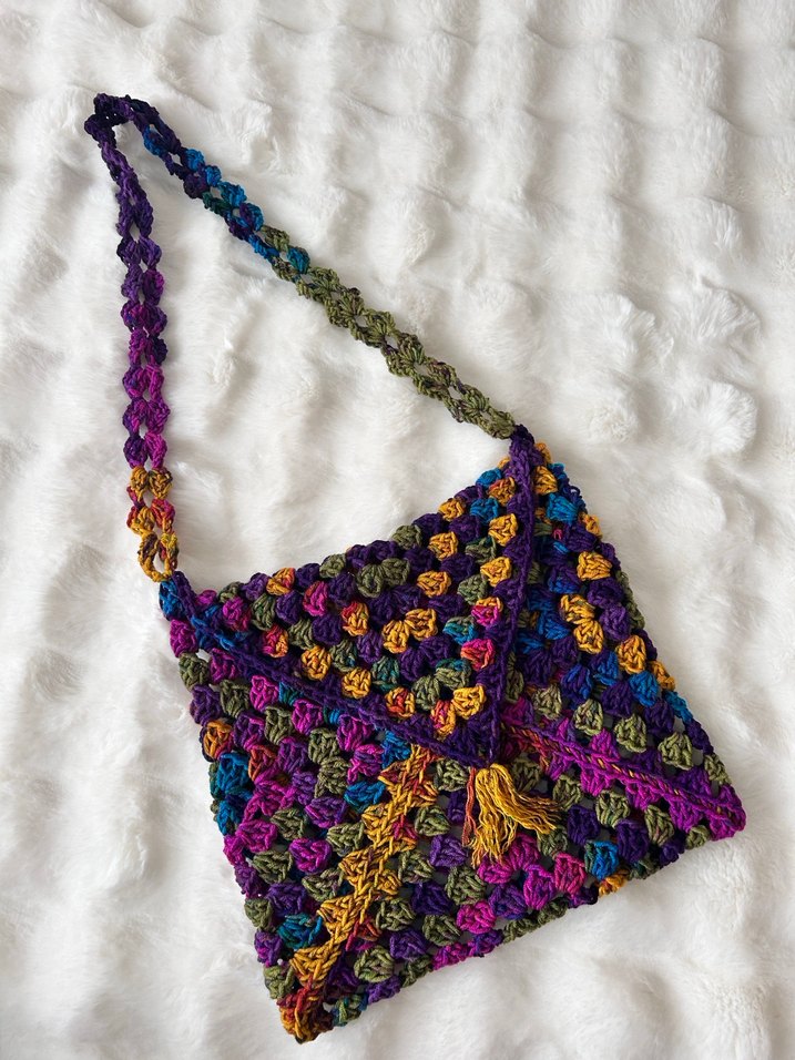 Renkli örgü bohem kadın çantası, bağlama desenli, uzun saplı ve kapaklıdır. Günlük kullanıma uygundur.