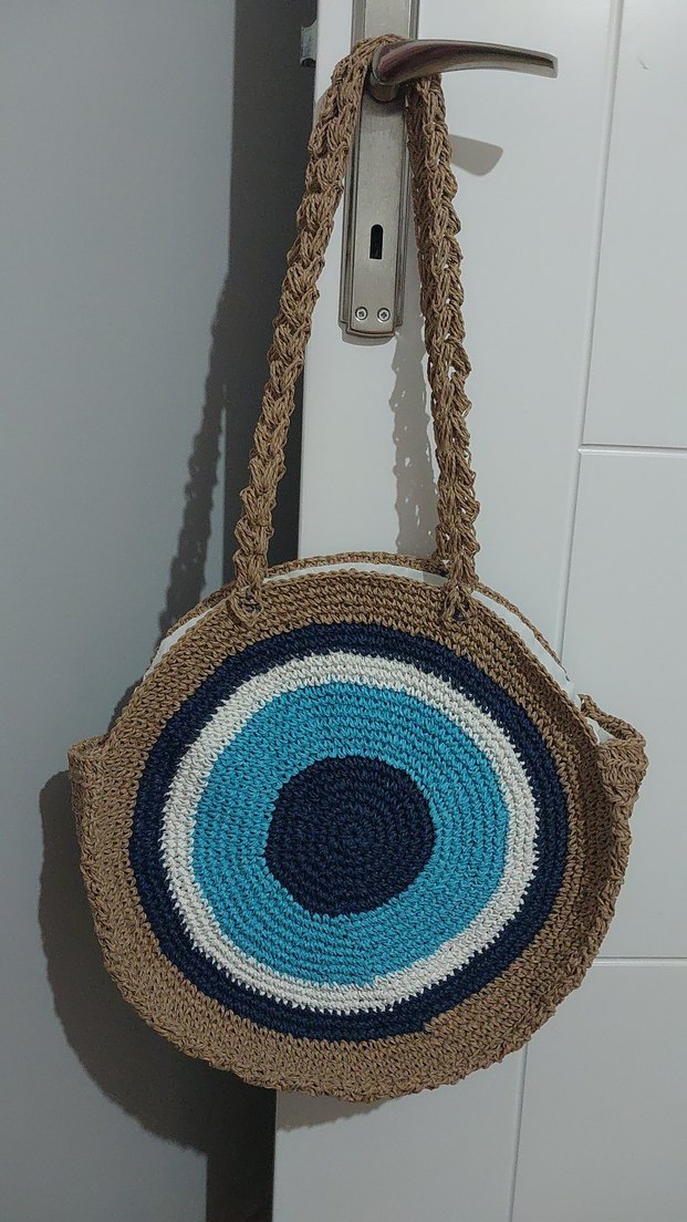 Renkli işlemeli, örgü bohem kadın çantası, günlük kullanım için uygun. Hafif ve canlı renkli tasarım.