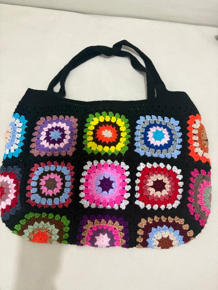Renkli örgü kare desenli, bohem tarzda kadın çanta. Günlük kullanıma uygun, retro ve hippie havası katar.
