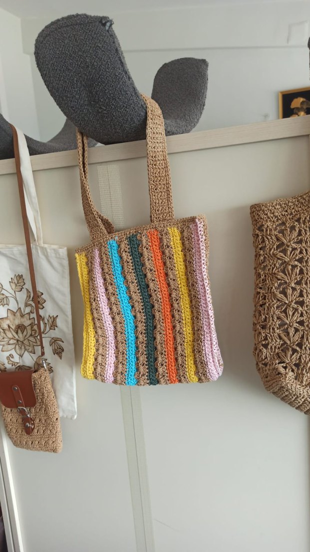 Pastel tonlarda tie-dye desenli, örgü bohem kadın çantasıdır. Günlük kullanıma uygundur.