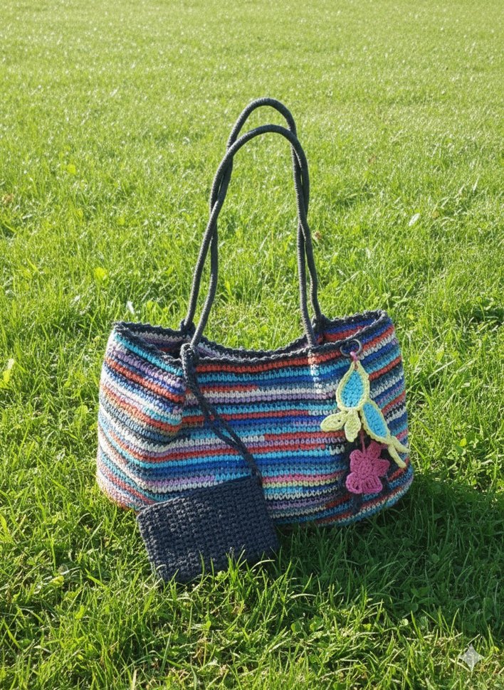 Renkli örgü iplikten, bağlama desenli ve çiçek süslemeli bohem tarzda kadın çantası. Günlük kullanıma uygun. Kağıt iple örüldü astarı yok farklı renk ve ebat sizin tercihiniz siz hayal edin biz hayata gecirelim