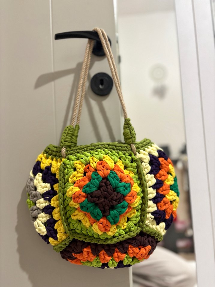 Renkli, desenli örgü kumaştan yapılmış bohem tarzda kadın çantası. Yumuşak dokulu ve ip askılı, günlük kullanıma uygun.