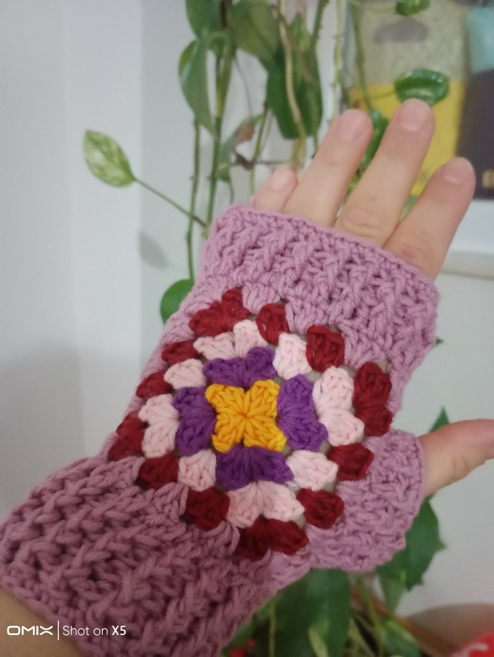 Renkli, örgü desenli ve bohem tarzda, yumuşak örgü kumaştan yapılmış kadın eldiveni.