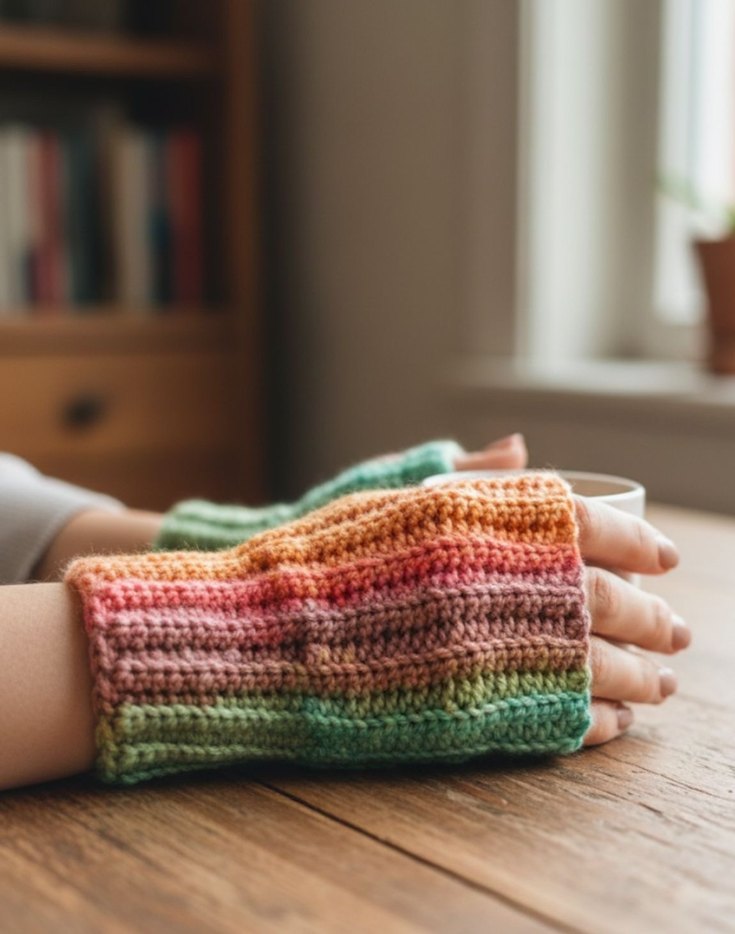 Yumuşak örgüden yapılmış, renkli ve bohem tarzda rahat kadın eldiveni, retro dokunuşlarla.