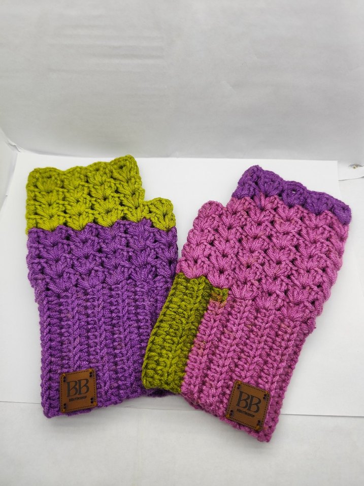 Canlı mor, pembe ve yeşil tonlarında dokuma desenli, rahat ve bohem tarzda renkli örgü kadın eldivenleri.