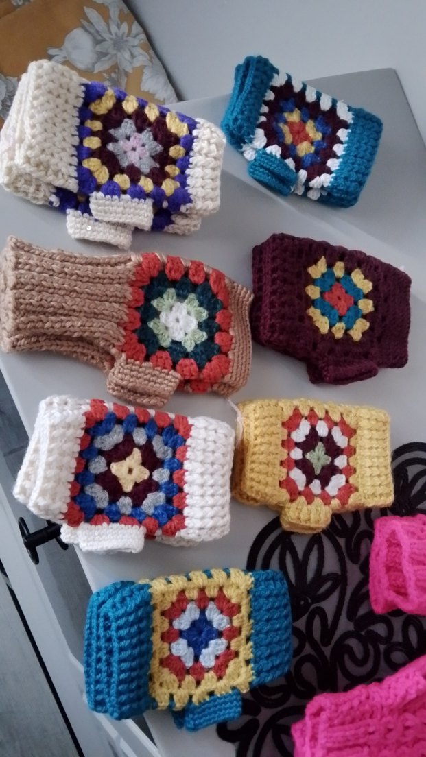 Renkli, örgü bohem tarzında kadın eldivenleri. Yumuşak örme kumaş ve canlı desenlerle rahat bir hippie görünümü sunar.