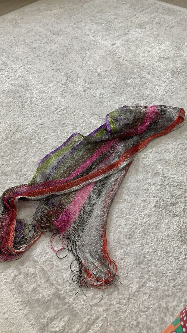 Bohem tarzda, örgü dokulu ve çok renkli çizgili kadın şalı. Hafif ve hava alan kumaşı, püsküllü kenarlarıyla dikkat çeker. Hiç kullanılmadı