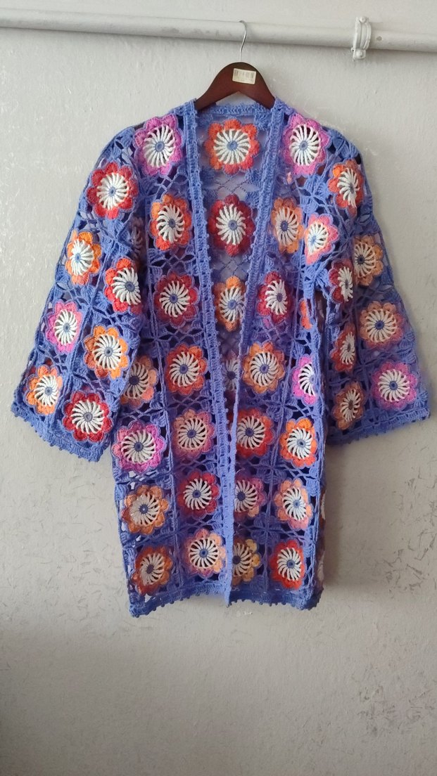 Renkli örgü, uzun kollu, salaş kesim, midi boy bohem hırka. Bağcıklı yakası ve tie-dye desenleriyle retro tarzda.