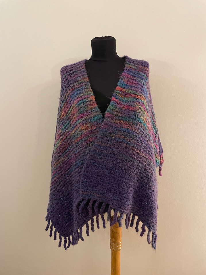 Renkli, koyu tonlarda çizgili ve püsküllü örgü bohem tarz kadın panço, rahat ve retro bir görünüm sunar.