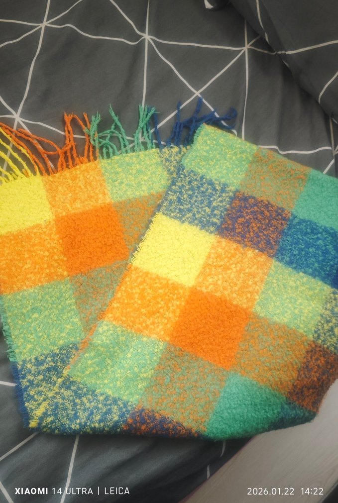 Atkı için kullanıma uygun Temiz kullanıldı defosu yok yıkandı. Renkli örgü, püsküllü kenarlarıyla bohem tarzına uygun rahat bir patchwork şal.