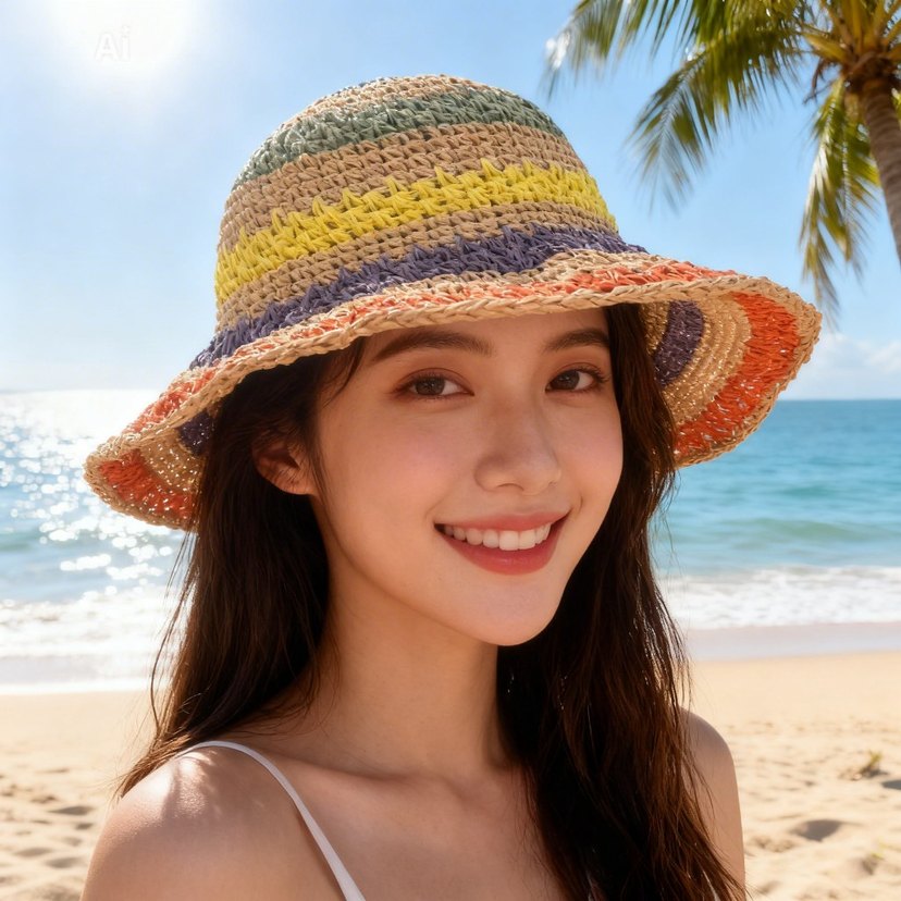 Kadınlar için pastel çok renkli çizgili örgü tasarıma sahip, rahat ve retro bohem stili yansıtan şapka.