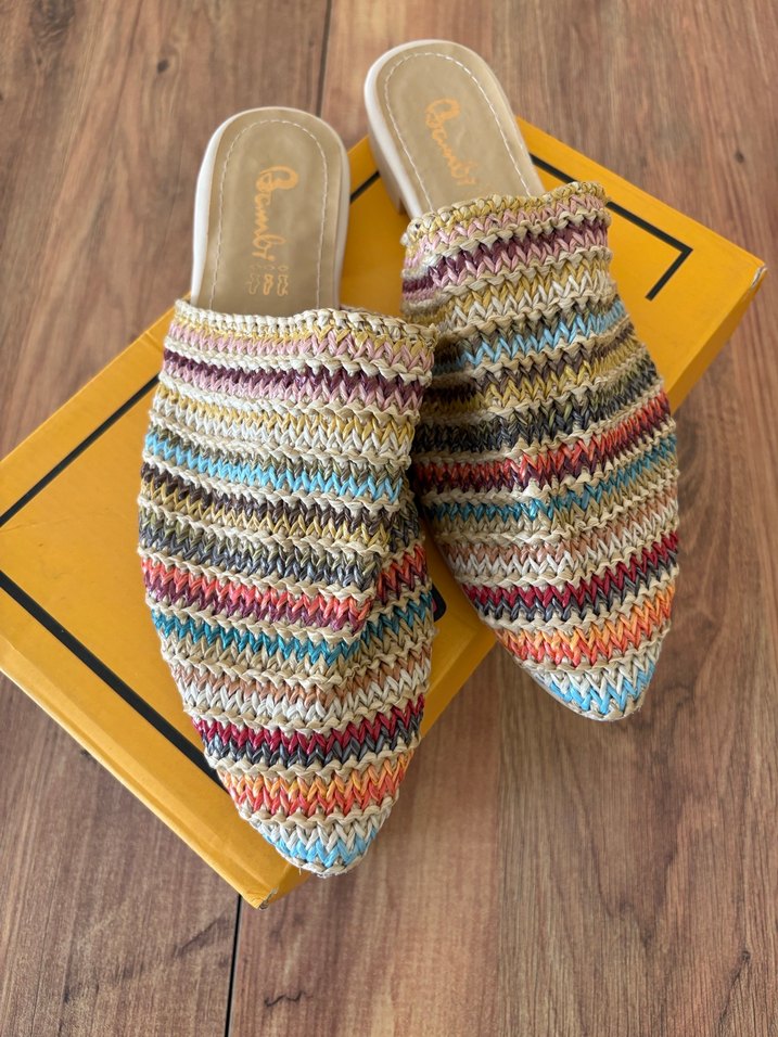 Renkli tie-dye örgü deseni ve kama topuklu bohem tarzı kadın terlik, günlük kullanım için uygundur. Hasır kullanılmadı 38 ama 37 uyumludur kutulu