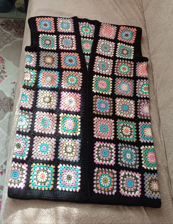 Kolsuz, bohem tarzda, bol kesim ve bisiklet yaka örgü yelek. Renkli desenleriyle günlük kullanıma uygundur. el emeğidir.yeni bitti.boyu 76 cm iki koltuk arası 51cm
