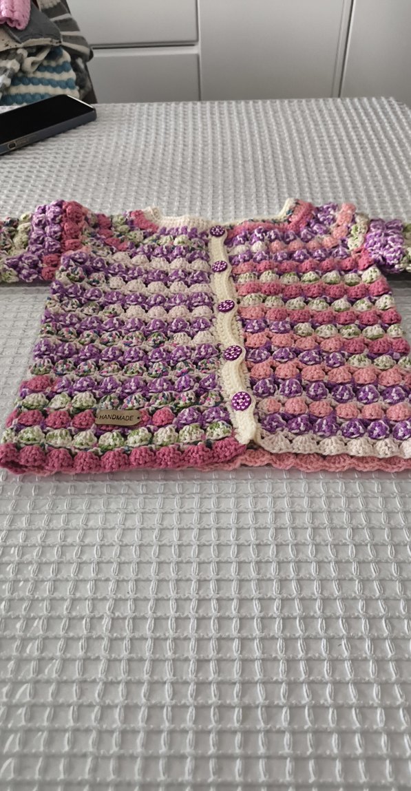Renkli örgüden yapılmış, bol kesim ve uzun kollu bohem tarzı kız hırkası, el yapımı detaylarla dikkat çekiyor.