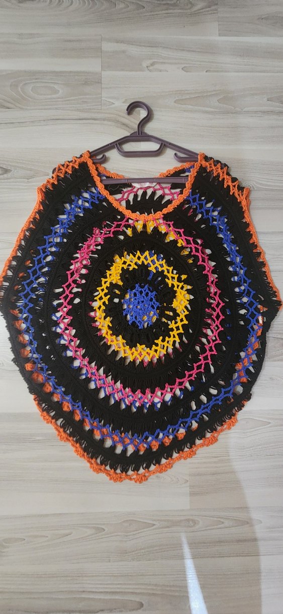 Renkli örgü kız panço, bol kesim, tekne yaka ve askılı kollara sahip, canlı batik desenli bohem tarzda. Penti plaj ürünü M/L