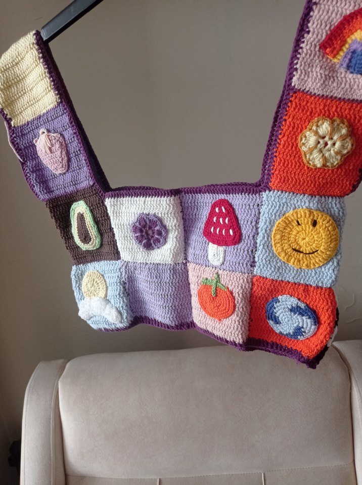 Gülümseyen yüz, mantar ve balkabağı gibi desenlerle renkli, el yapımı bohem örgü üst.