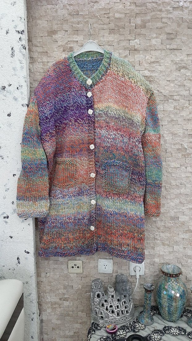 Pastel çok renkli, uzun ve bol yeni örüldü sıfırdır 54 bedene kadar olur 750 tl tutarinda ip harcadım 750 de emek parasi ölçuleri iki koltuk arası 75 cm boy 95 cm dir
