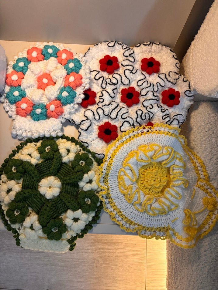 Çiçek desenli, çeşitli canlı renklerde renkli örgü banyo lifi seti. Tekli alımda Adet 250 tl