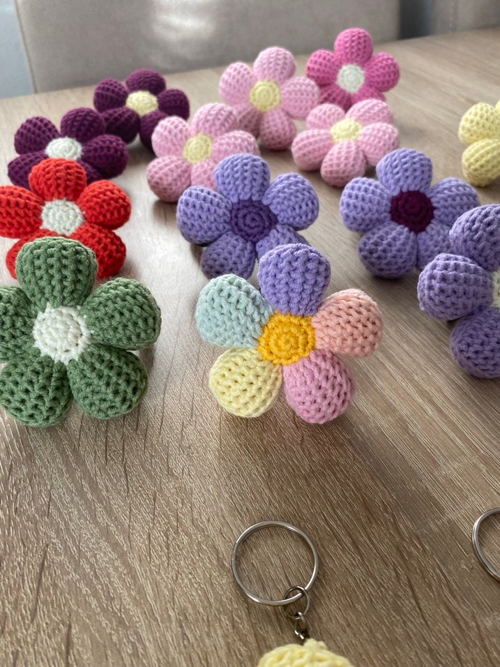 Renkli örgü çiçeklerden yapılmış anahtarlık, rahat ve bohem tarzda, anahtarlarınıza retro bir dokunuş katar. İstenilen renkte sipariş alınır. Adet fiyatıdır