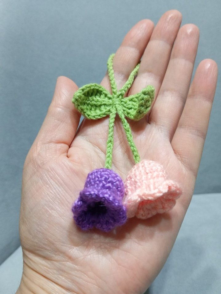 Mor ve pembe iki çiçek ile yeşil yapraklardan oluşan, rahat bohem tarzda renkli örgü anahtarlık
