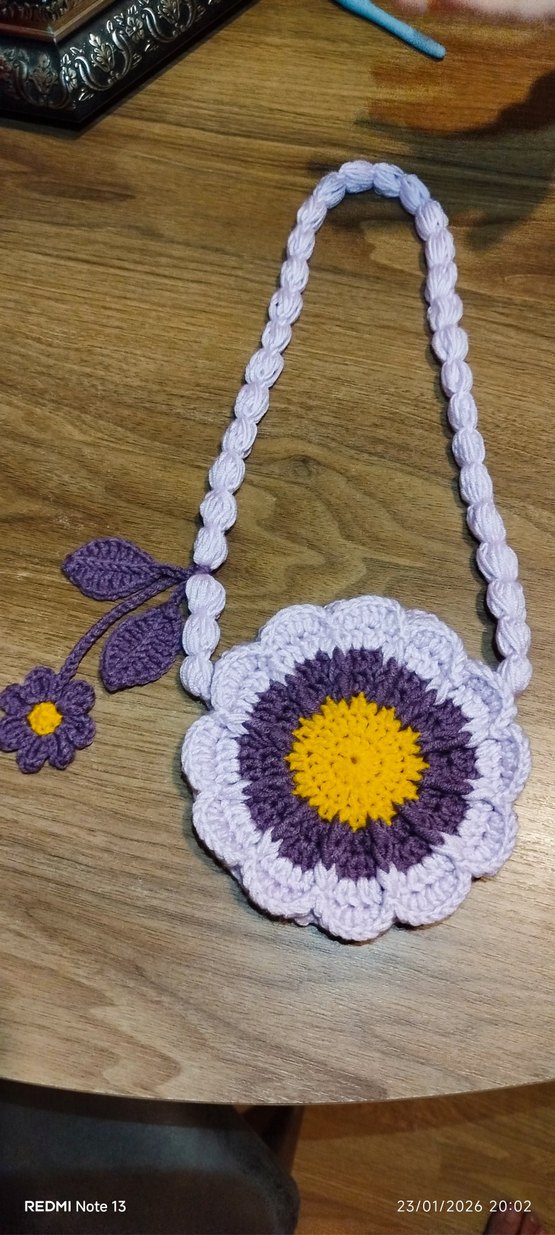 Mor, lila ve sarı tonlarında çiçek deseniyle renkli örgü bohem tarzda çanta. Örgü askısı ve süslemeleri bulunur.