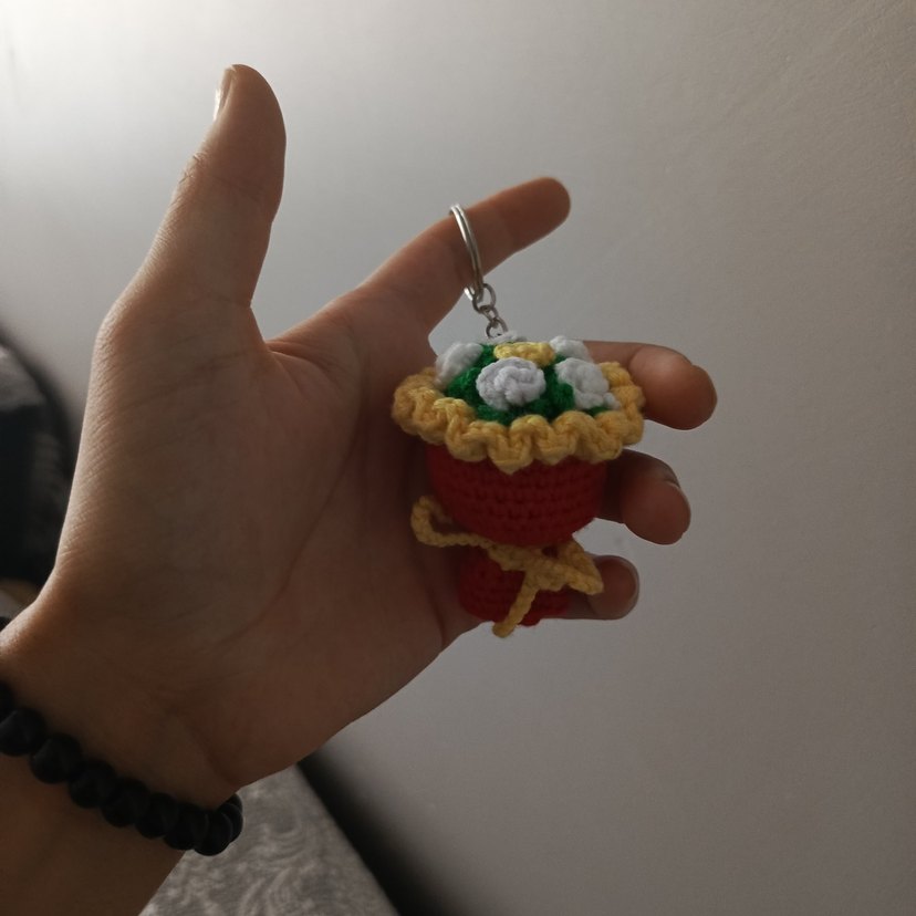 Renkli örgü çiçekli anahtarlık, küçük çiçeklerle süslü, rahat ve bohem tarzda.