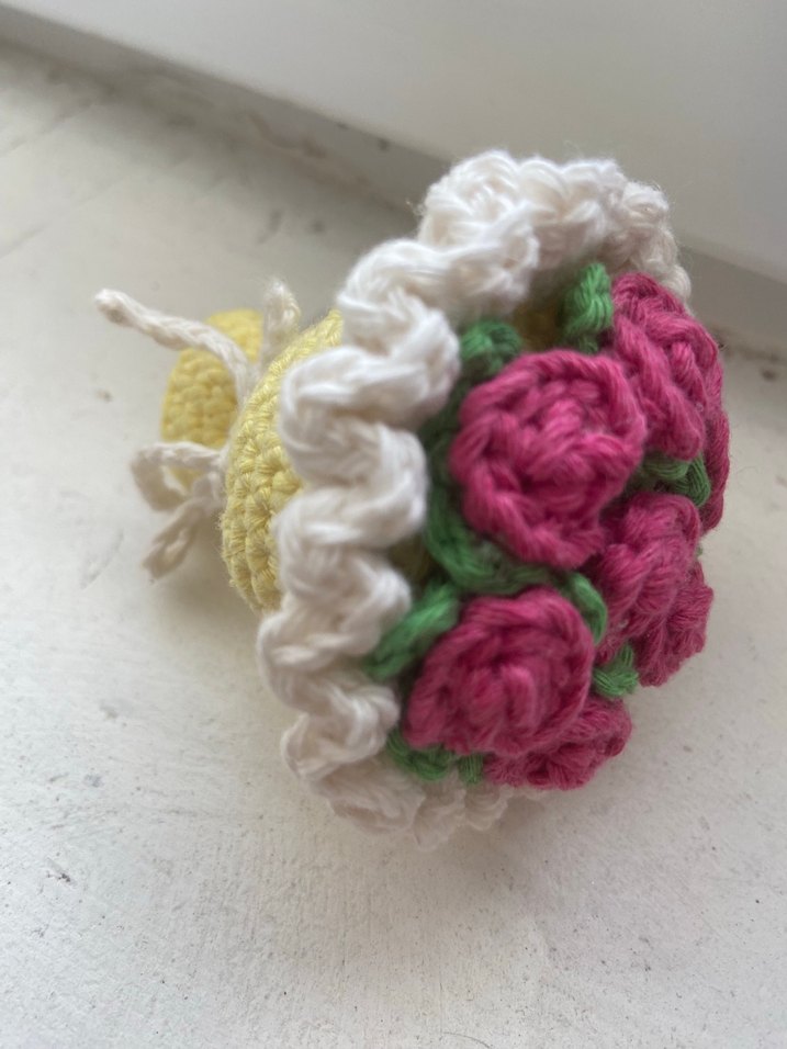 Bu renkli broş, örgü pembe çiçekler, yeşil yapraklar ve beyaz fırfırlı kenar ile sıcak bir bohem tarzı yansıtıyor. İstenilen renk ve modelde yapılır