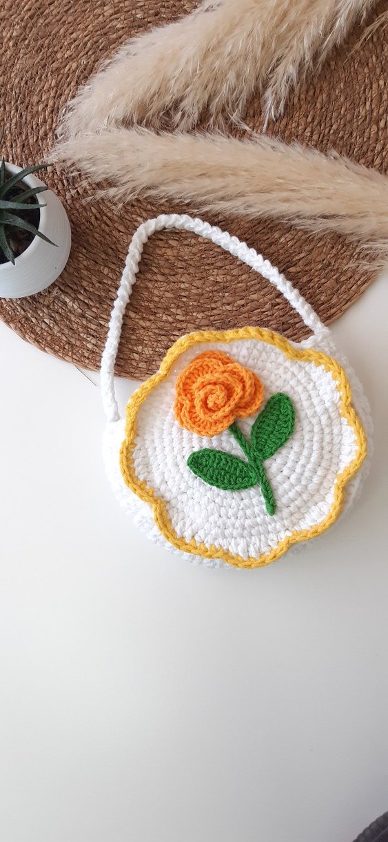 Renkli örgü çiçek desenli, beyaz tabanlı, sarı kenarlıklı yuvarlak bohem çanta. Örgü sapı vardır. cocuklar icin uygundur