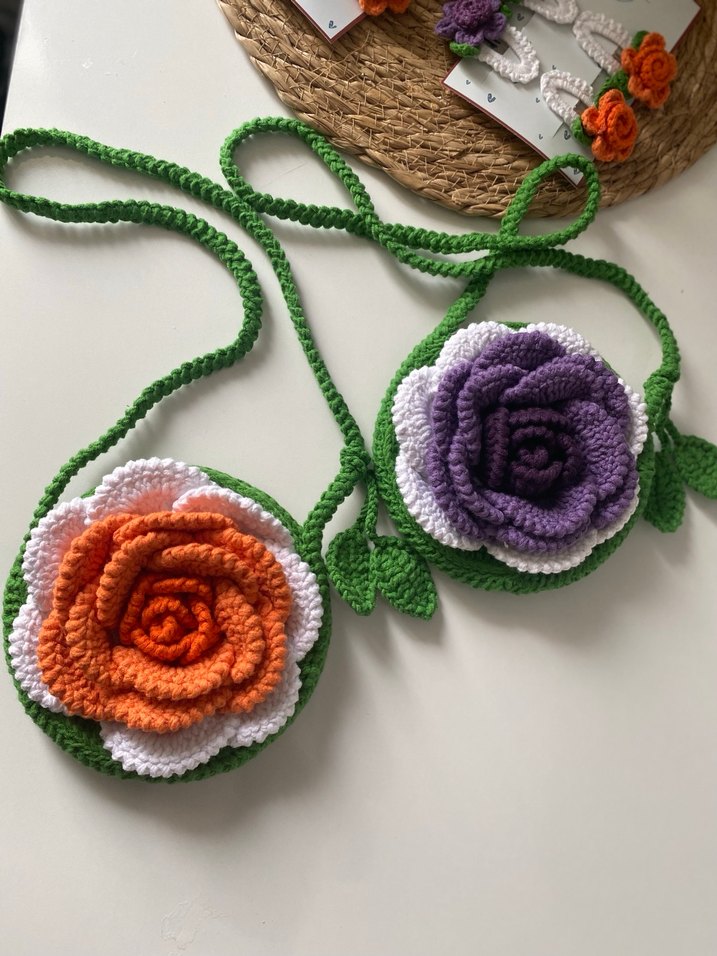 Canlı turuncu ve mor çiçek desenleriyle renkli, örgü bohem tarzında kız çantaları.