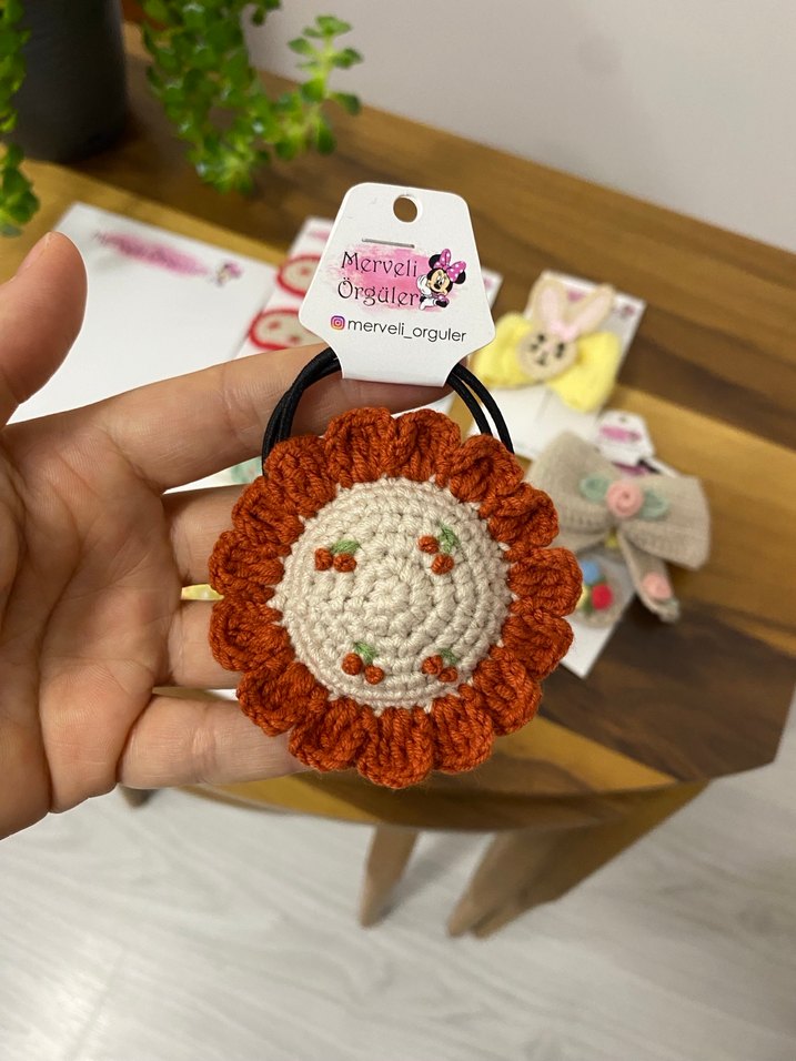 Renkli örgü ve kahverengi tonlarda çiçek desenli, bohem tarzda çocuk saç lastiğidir. Verilen fiyat tek adet fiyatıdır. İstenilen renkte hazırlanabilir.