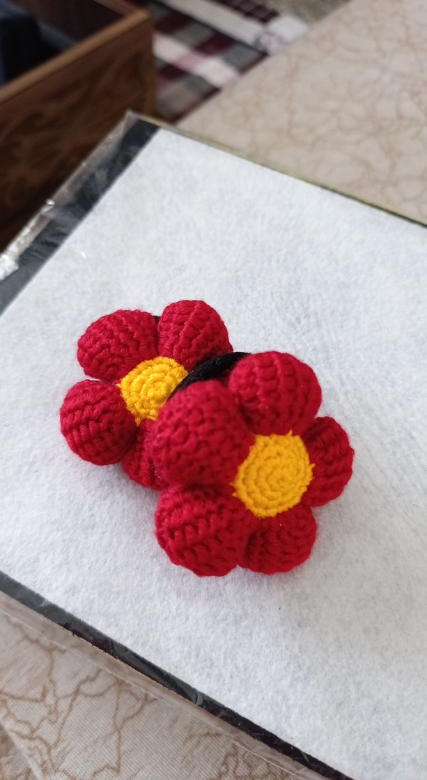 Renkli, kırmızı ve sarı örgü çiçek şeklinde, bohem ve retro tarzda çocuk saç tokası.