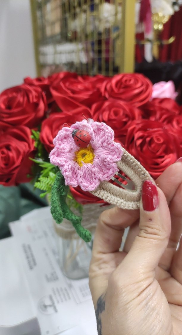 Örgü pembe çiçek ve küçük uğur böceği detaylı renkli çocuk saç tokası, bohem tarzına uygun.