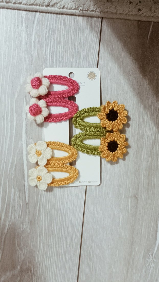 Pembe, yeşil ve sarı tonlarda çiçek desenli renkli, örgü çocuk tokaları. Bohem tarzda saçlara neşeli bir dokunuş katar.