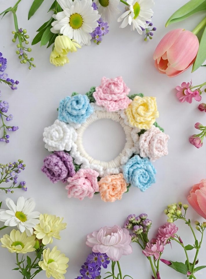 Bohem tarzda, örgüden yapılmış pastel renklerde çok renkli çiçekler içeren kadın saç tokası. Rahat ve retro bir görünüm sağlar.