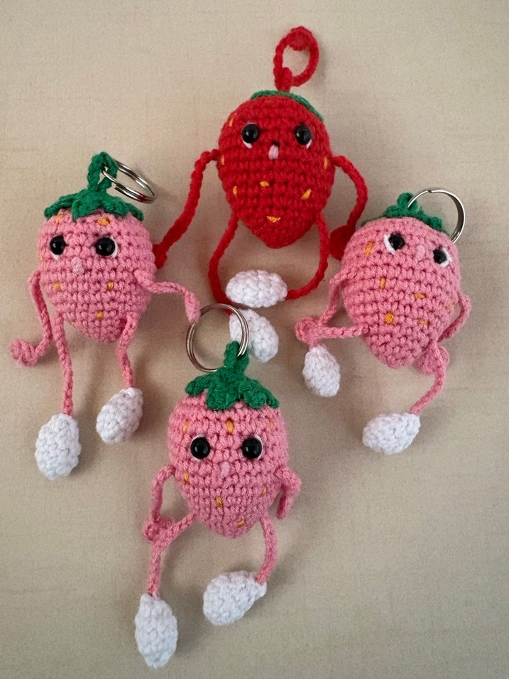 Renkli, örgü çilek anahtarlıklar; sevimli gözler ve sallanan bacaklarla bohem tarzı için uygun. Sipariş alınır Tane fiyatıdır. En az 3 adet siparişe gönderebiliriz