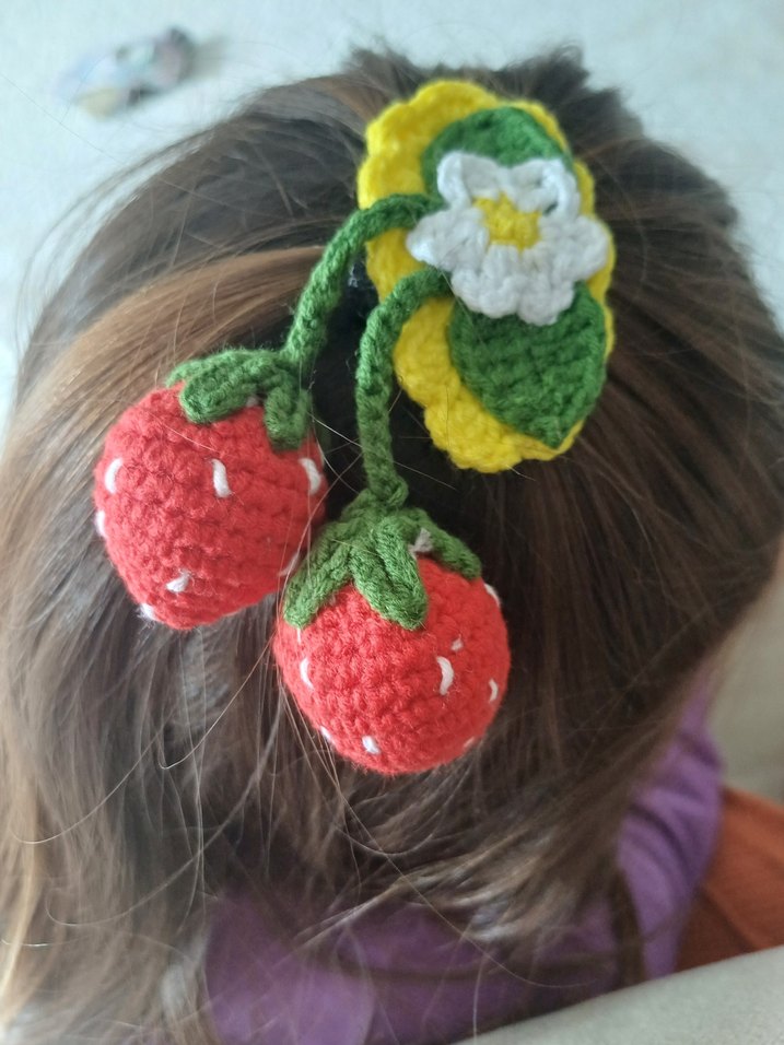 Renkli örgü malzemeden yapılmış, nakışlı çilek ve çiçek detaylarıyla bohem tarzını yansıtan çocuk saç tokası.