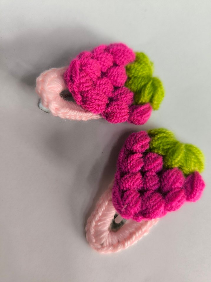 Örgü pembe çilek şeklinde çocuk tokaları, yeşil nakışlı yapraklarla renkli ve retro bohem tarzda.