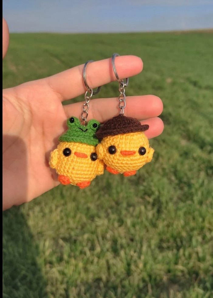 Bohem tarzda, renkli örgü civciv anahtarlıklar; biri kurbağa şapkalı, diğeri kahverengi bere takıyor.