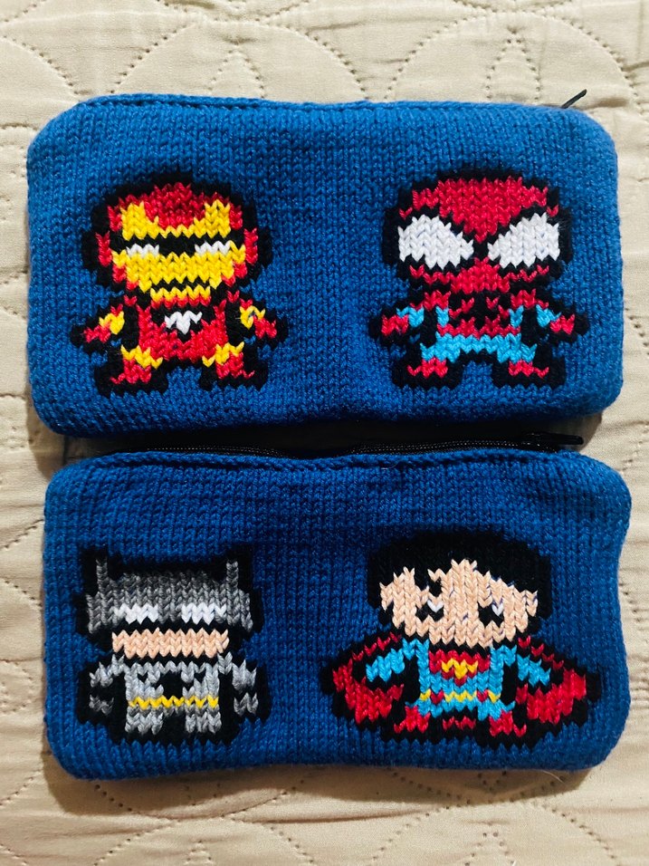 Renkli örgüden yapılmış, demir adam, örümcek adam, batman ve süpermen nakışlı çocuk kalemliği Kız içinde istenilen kahraman yapılabilir