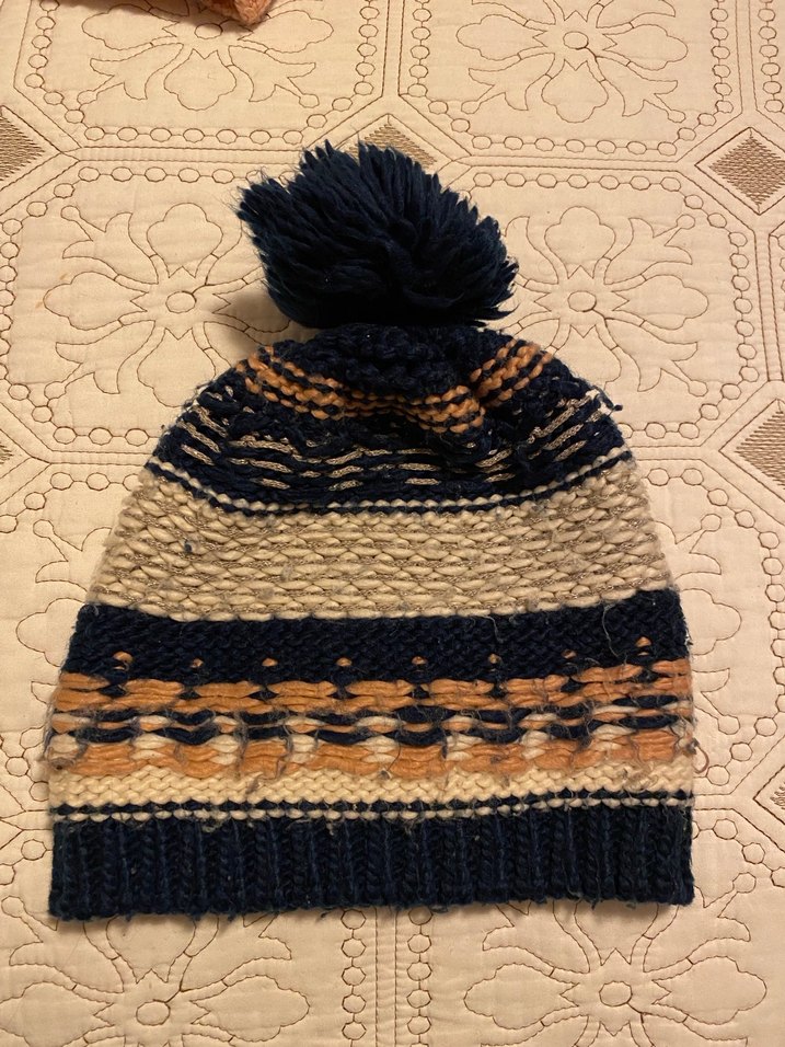 Bu kadın bere, koyu renkli çok renkli çizgiler ve üstünde ponpon ile örülmüş, rahat ve bohem tarzda tasarlanmıştır. Flaşlı ve flaşsız olarak çektim