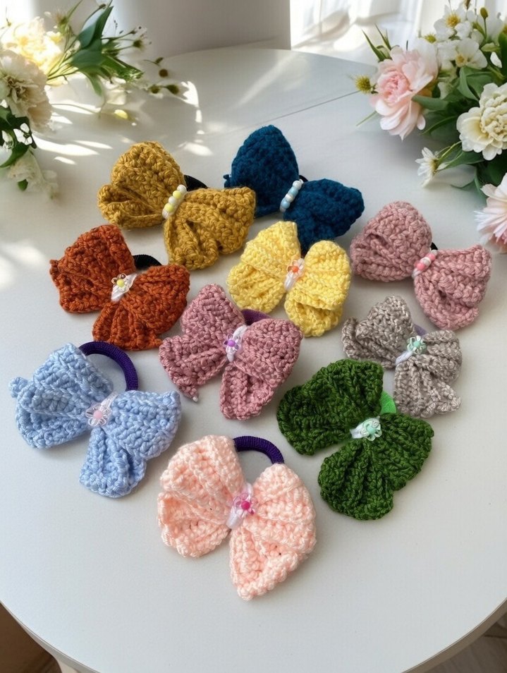 Renkli, örgü çocuk saç tokaları, sade ve bohem tarzda, ortasında küçük boncuk detaylı.
