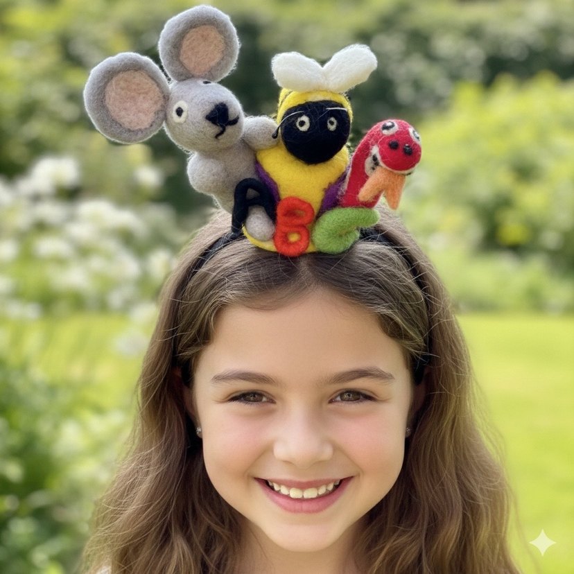 Renkli örgü malzemeden yapılmış, kişiye özel temalı eğlenceli çocuk taçı.