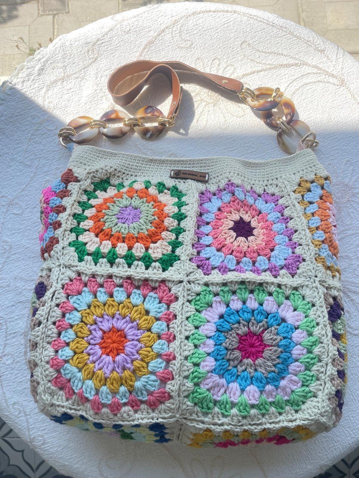 Renkli örgü kareler ve dantel detaylarıyla bohem tarzda kadın çantası. Hafif çok renkli desenli, şık halkalı askıya sahip, günlük kullanıma uygun.