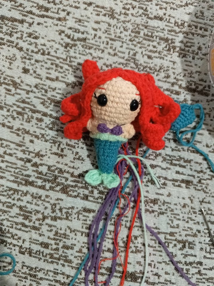 Bu renkli örgü bebek, parlak kırmızı saçlara ve turkuaz kuyruğa sahip deniz kızı şeklindedir. Büyük siyah gözleri ve küçük mor bir üstü vardır. ♀️